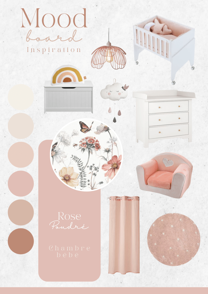 Dans l’ensemble, ce mood board « Rose Poudré » propose une ambiance douce et harmonieuse, alliant fonctionnalité et esthétique délicate, parfaite pour une chambre de bébé fille. L’utilisation de tons pastel et d’éléments naturels crée une atmosphère à la fois apaisante et accueillante, idéale pour un espace de repos et de jeu.