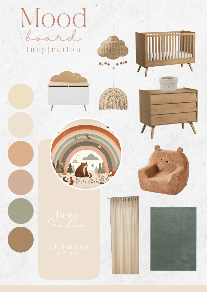 Le mood board « Beige Tendre » pour une chambre de bébé offre une atmosphère douce et chaleureuse, avec une palette de tons neutres et naturels qui sont à la fois apaisants et intemporels. Ce style est idéal pour créer un espace confortable et accueillant pour un bébé, tout en étant neutre en termes de genre.
