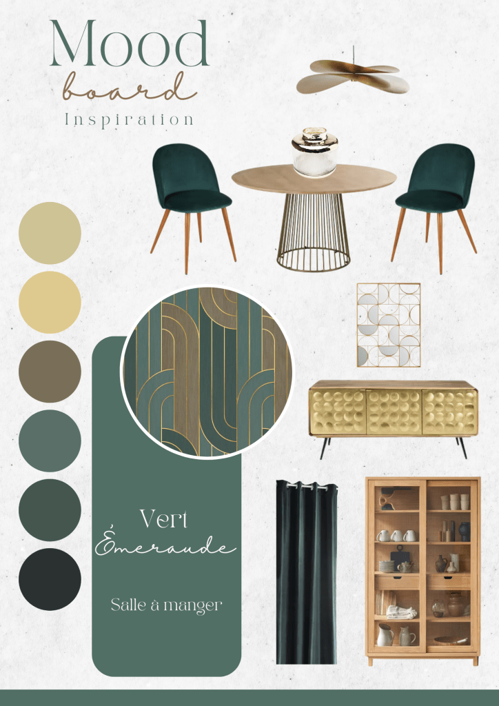 Le mood board « Vert Émeraude » pour une salle à manger dégage une atmosphère à la fois chic et naturelle, idéal pour une salle à manger qui vise à être à la fois accueillante et opulente, inspirée par les tons profonds de vert et des touches dorées élégantes. Ce style est parfait pour une salle à manger sophistiquée, avec une ambiance qui mêle le modernisme et une touche rétro.