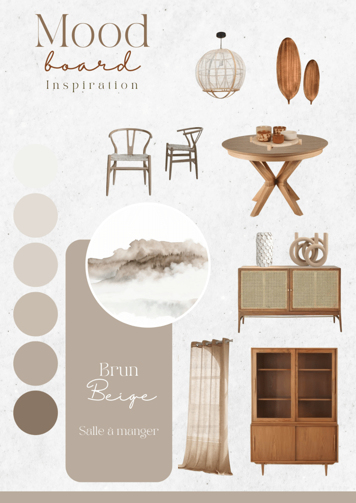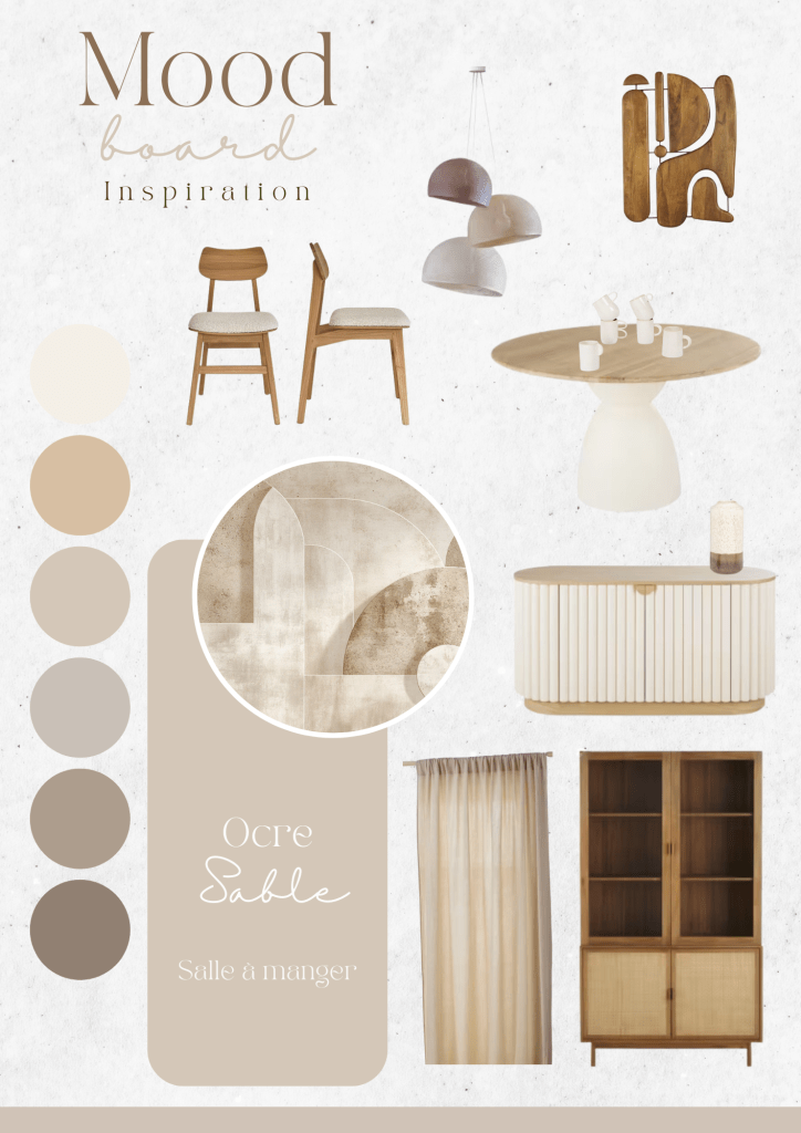Ce mood board vous propose une inspiration douce et chaleureuse pour aménager une salle à manger au charme authentique. Avec des tons ocres et des nuances naturelles, cet espace évoque une ambiance apaisante et lumineuse, idéale pour des repas conviviaux.