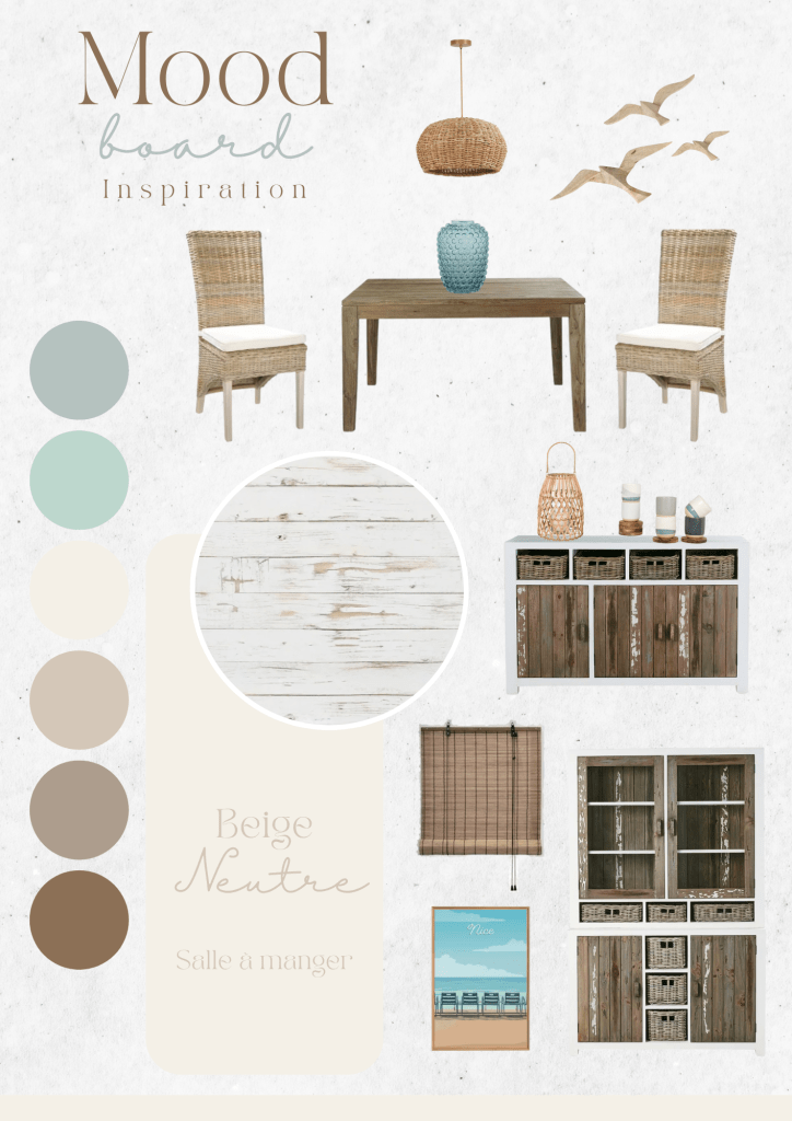 Plongez dans l’ambiance sereine et apaisante de ce mood board conçu pour une salle à manger chaleureuse et accueillante.